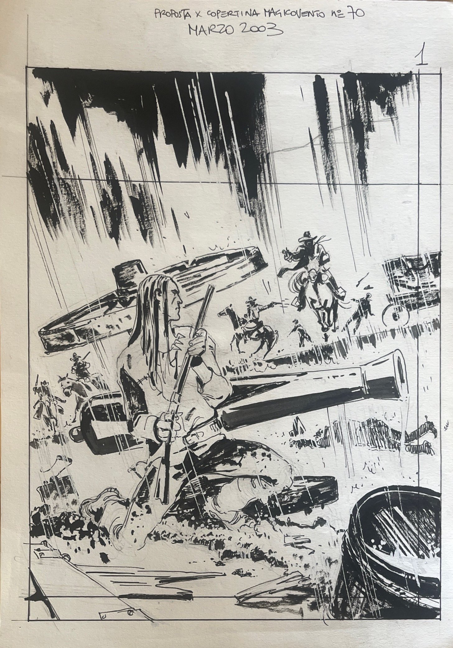 Formato 21×29,5, disegno/bozzetto a matita e china acquarellata di Pasquale Frisenda.